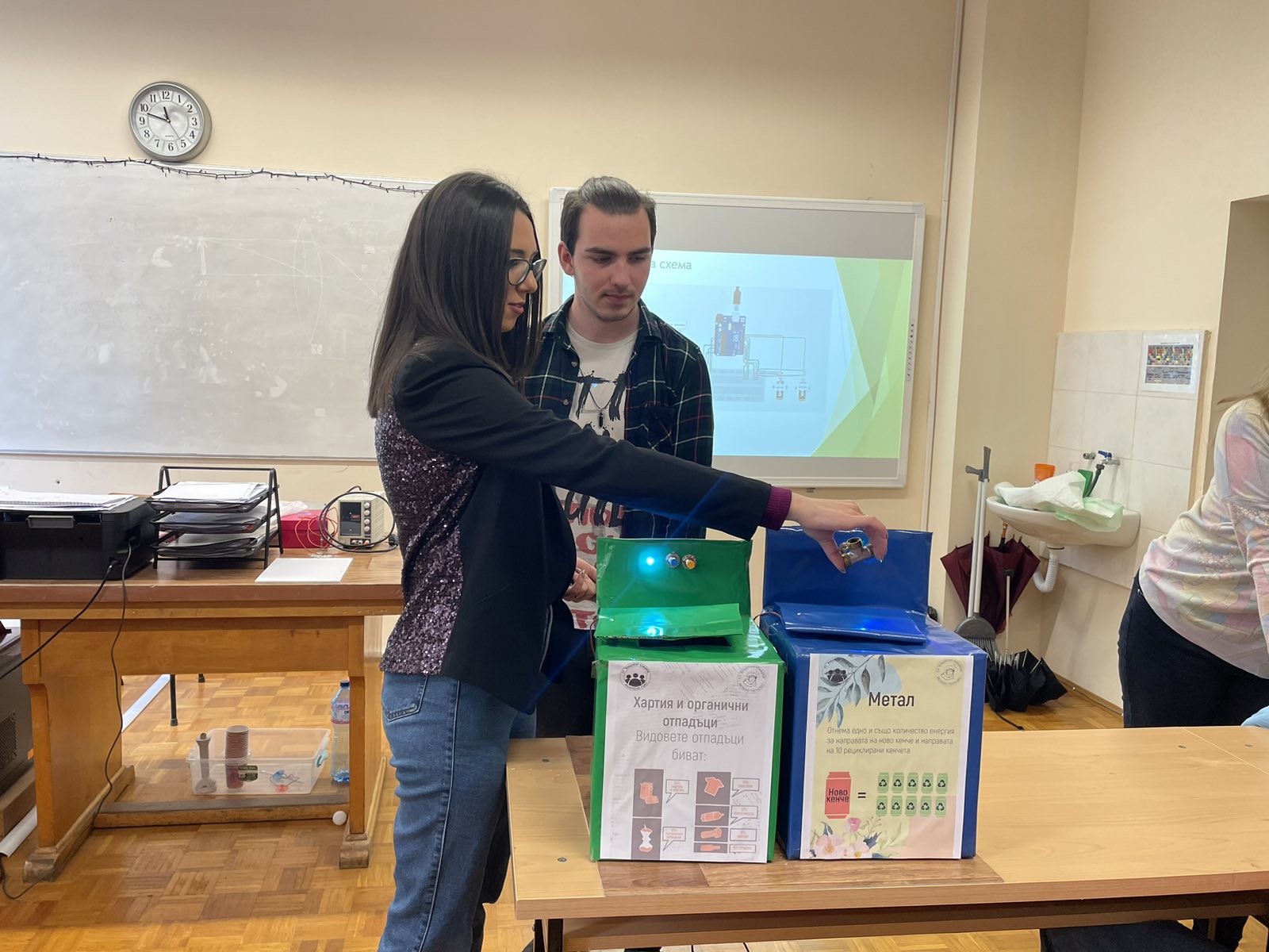 „Самият отпадък се разпознава още на входа на коша. Той се отварят или не в зависимост от това какво се доближи до съответния кош“, обяснява Деница Димитрова Димитрова, която също помага на Ученическия съвет за реализирането на идеите.