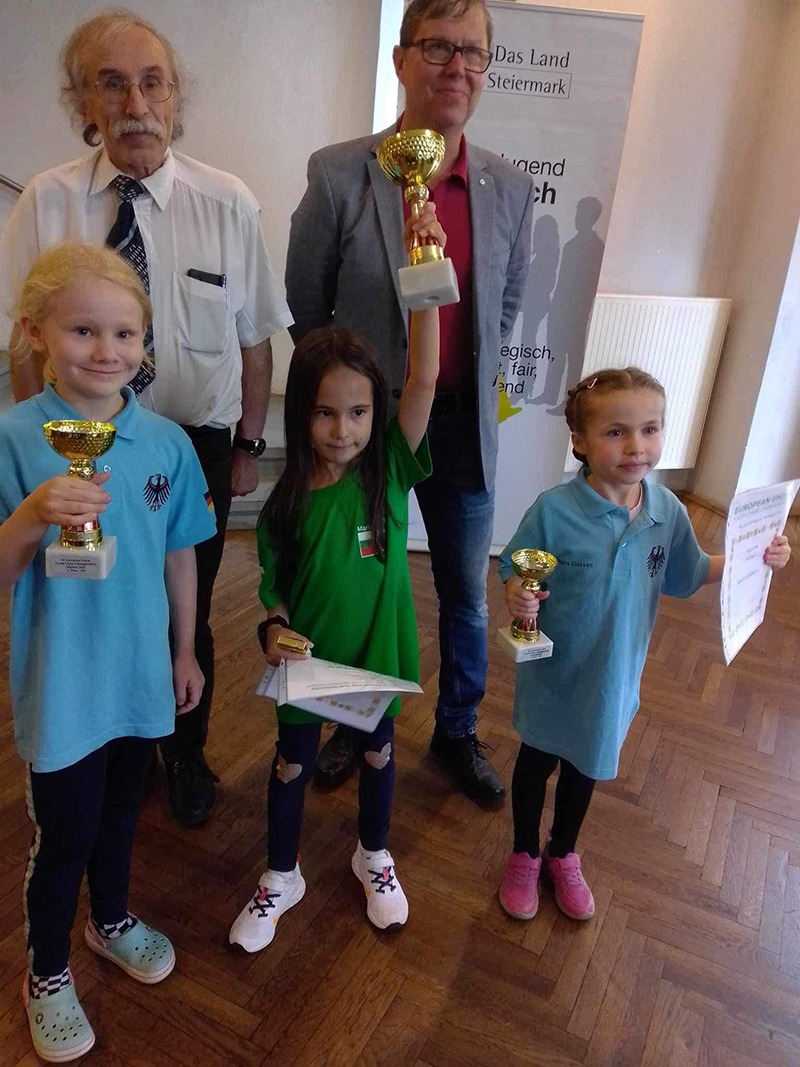 Три първи и едно четвърто място печелят малките български шахматисти от XX първенството на Европейския съюз за момчета и момичета от 8 до 14 години, завършило преди дни в Мюрек, Австрия, съобщават от Българската федерация по шахмат 2022.