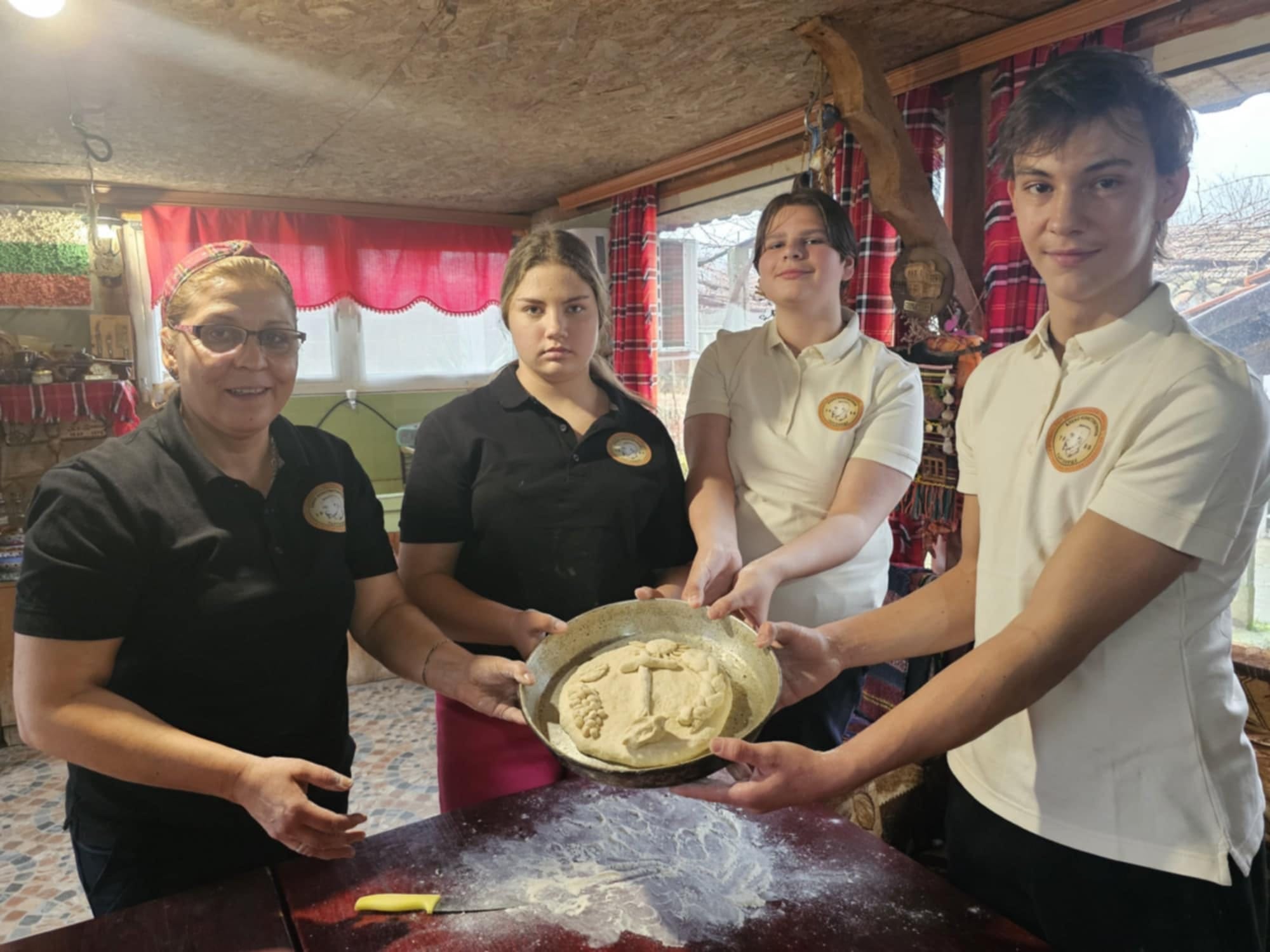 Как се меси содена питка, какво трябва да правим на Бъдни вечер и какво да сложим на трапезата, показват и разказват ученици от Професионалната гимназия по туризъм и хранително-вкусови технологии „Алеко Константинов“ в Търговище и техният ръководител по практическо обучение Божанка Дамянова на децата от класа на Светла Храброва в Българското училище „Васил Левски“ в Хага, Нидерландия.