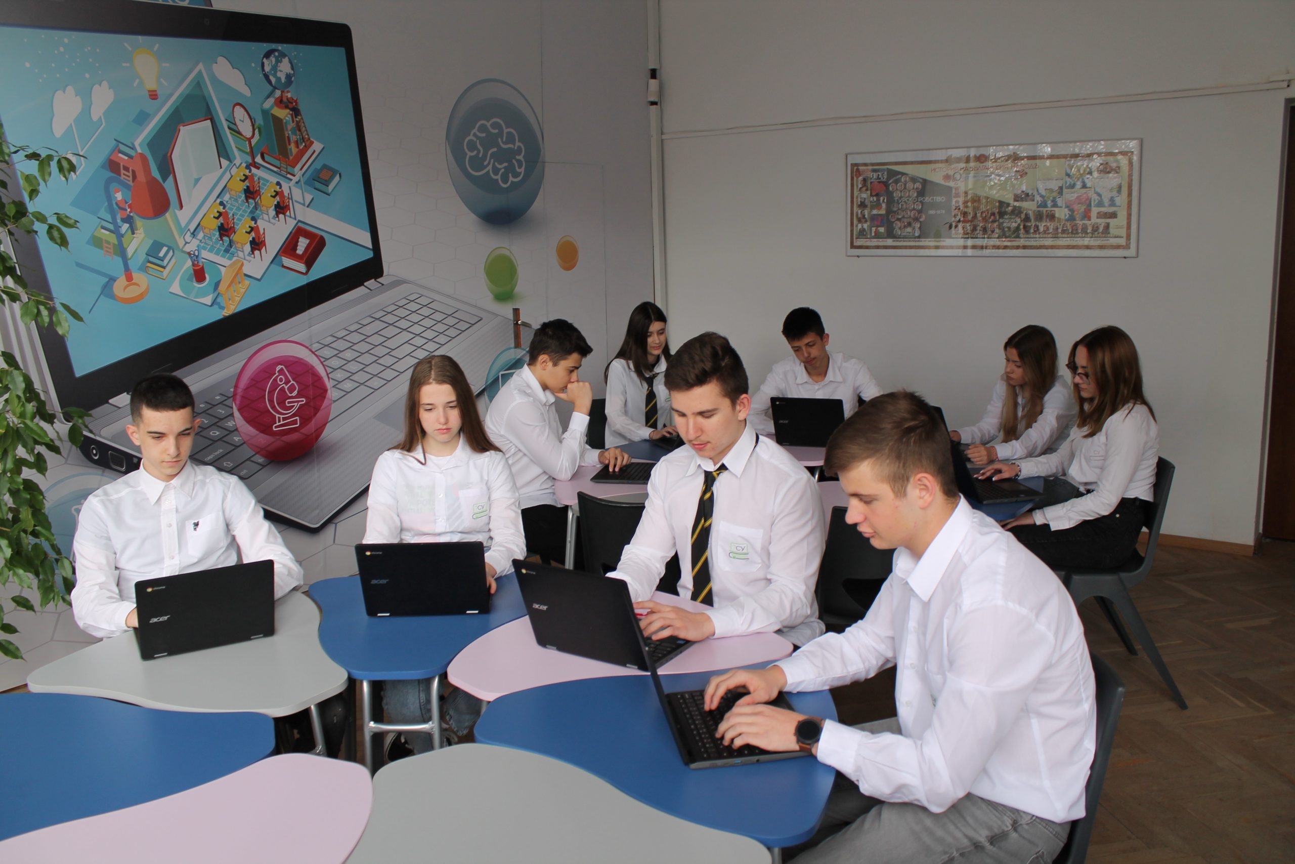 „Въпреки това винаги има проблем с мотивацията, защото са по-интересни устройствата – казва Мария Нестерова. – Но се стремим да ползваме технологиите в гимназиален етап в помощ на обучението. Училището работи по модела 1:1, като устройствата са осигурени от училището за всеки ученик и учител в гимназиален етап. Използват се и различни образователни платформи.“