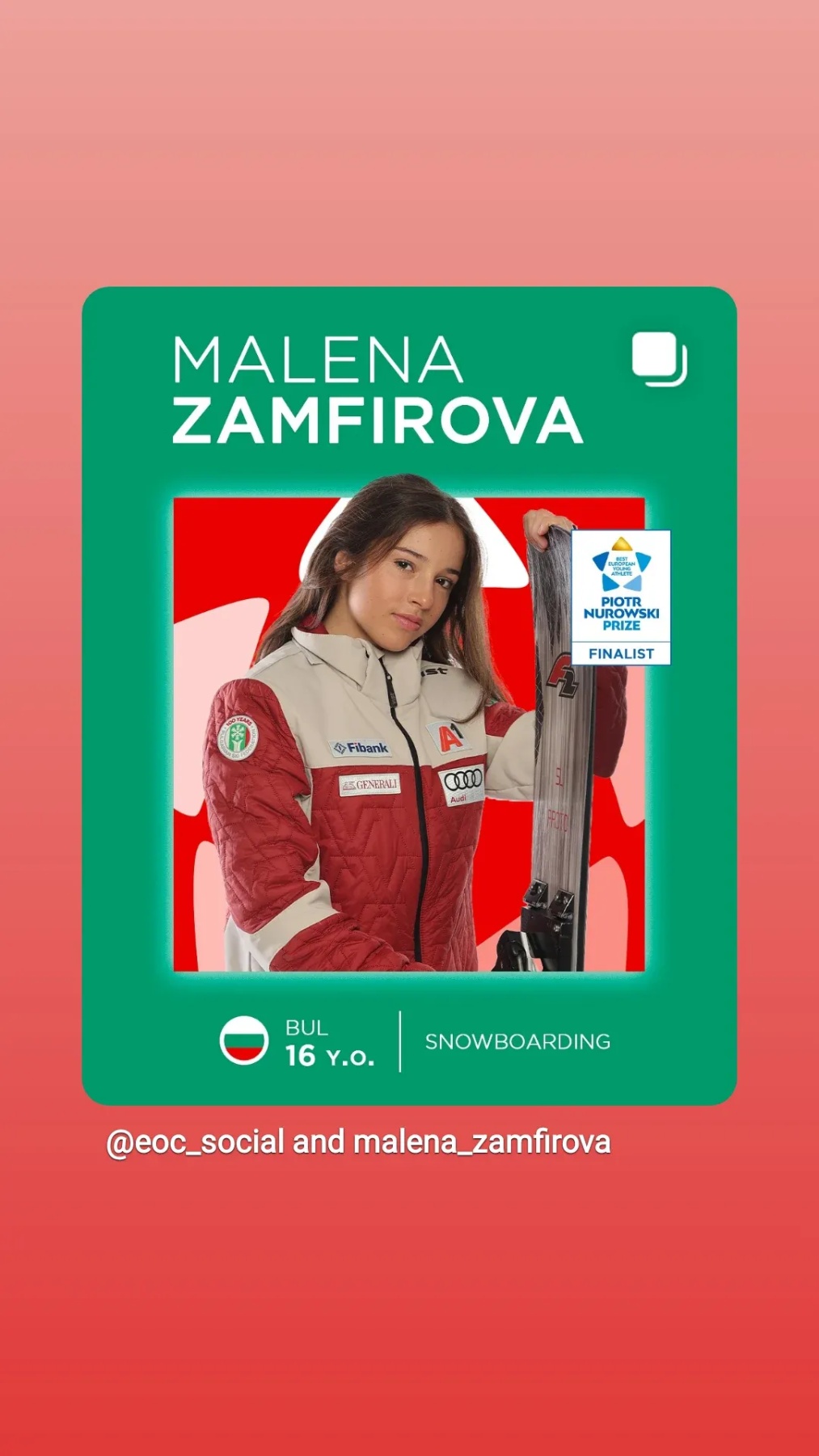 Българската сноубордистка Малена Замфирова триумфира в 10-тото зимно издание на наградата „Пьотр Нуровски“ за най-добрия млад спортист на Европейските олимпийски комитети