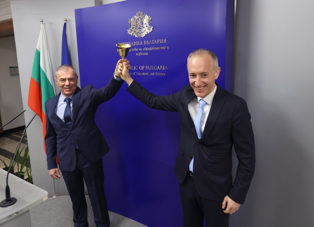 В края на церемонията двамата символично удариха училищен звънец, с което по традиция се предава постът в МОН през годините.